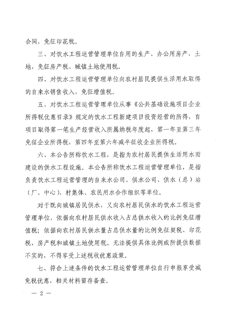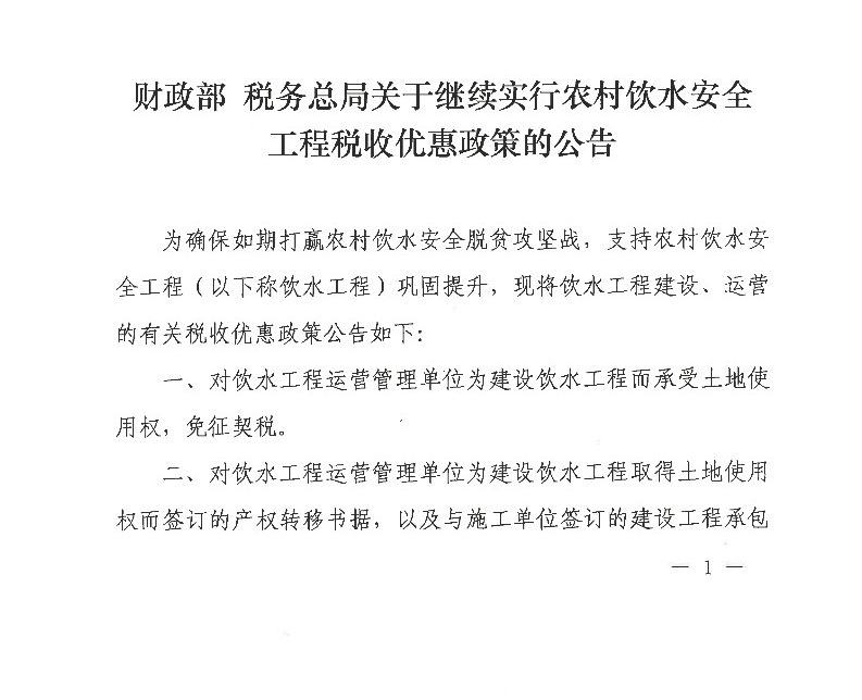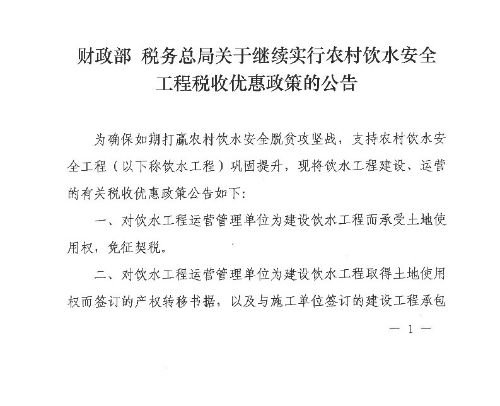 关于继续实行农村饮水安全工程税收优惠政策的公告