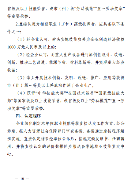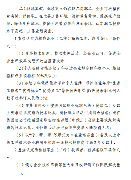 (五)广泛自主开展职业技能等级认定。初级工、中级工、高级工、技师、高级技师等级考核是技能考核评价的主体,经人力资源社会保障部门备案的用人单位,可依据《国家职业标准》、行业企业评价规范等,面向本单位职工自主开展技能人才评价。鼓励用人单位在职业技能等级认定工作初期,制定定级考评和直接认定的操作细则,面向本单位职工广泛开展职业技能等级认定。定级考评可根据岗位条件、职工日常表现、工作业绩等开展,可与岗位练兵、技术比武、技术攻关、揭榜领题等相结合,支持打破学历、资历、年龄、比例等限制,对技艺高超、业绩突出的一线职工,依据直接认定工作指引(附件2)细化制定本单位工作方案后按程序组织实施。