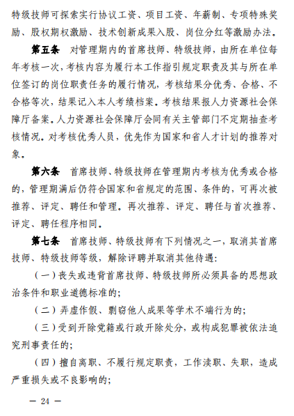 (八)加强高技能领军人才管理。建立首席技师、特级技师三年管理期制度,对管理期内的首席技师、特级技师,所在单位要细化明确其职责,设置年度考核和终期考核,考核结果记入本人档案并报人力资源社会保障厅备案。对考核优秀人员,优先作为国家和省人才计划的推荐对象。建立退出机制,对管理期内考核不合格等情形的评聘人员,由所在单位提出处理意见,按程序报人力资源社会保障厅审定后,取消其首席技师、特级技师等级,解除评聘并取消相关待遇(附件4)。