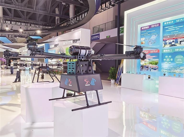 在展区的另一面,是“工业强市”的“硬实力”。“攀枝花造”首台氢能源无人机“氢程1.0”首次亮相大型展会,该机型是以钛合金为结构件的“新能源+新材料”氢能运载多旋翼无人机,在无人机行业里处于领先水平,在同等基础条件下,可大幅提升无人机作业时间及运载能力,目前,该机型最大有效飞行时间大于60分钟,相较于传统锂电池续航时间提升3.3倍,最大负载可达50公斤,适用于多类低空应用场景。“我们希望通过西博会这个平台,让大家知道攀枝花有自己生产制造的低空经济产品,我们有这个研发能力。未来,我们会在攀枝花深度融合新能源、新材料来发展低空经济。”参展商、四川雨燕航翼通航科技集团有限公司董事长邓骁说到。