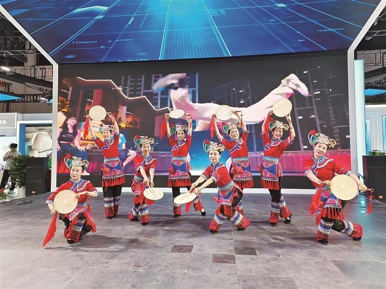 展区两侧,“软硬”相宜,而展区中间,则是文艺盛宴,有由羊皮鼓舞改编的彝族舞蹈《鼓舞声声木棉开》,省级非遗编舞《傈僳欢歌》,更有超有范儿的傈僳族服装T台秀。高挑的模特,绚丽的服饰,每当傈僳族服装T台秀走起来,攀枝花综合展区总是被人群簇拥。来自中国、突尼斯、巴西、美国等地的模特,完美展示盐边傈僳族服饰,传统与现代时尚碰撞相融,走出了文化自信,也走出了攀枝花的自信。“太美了,真切地理解了那句话,民族的就是世界的。”游客李虹君看了表演后连连称赞。