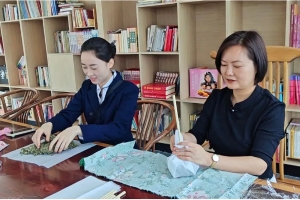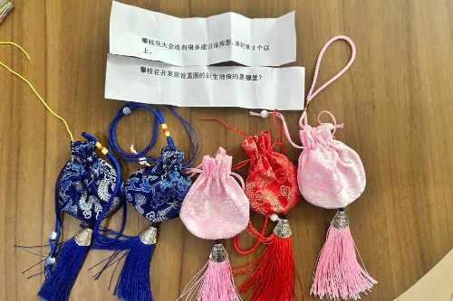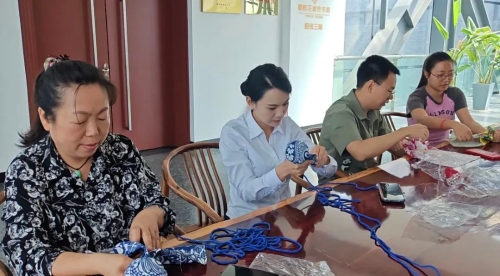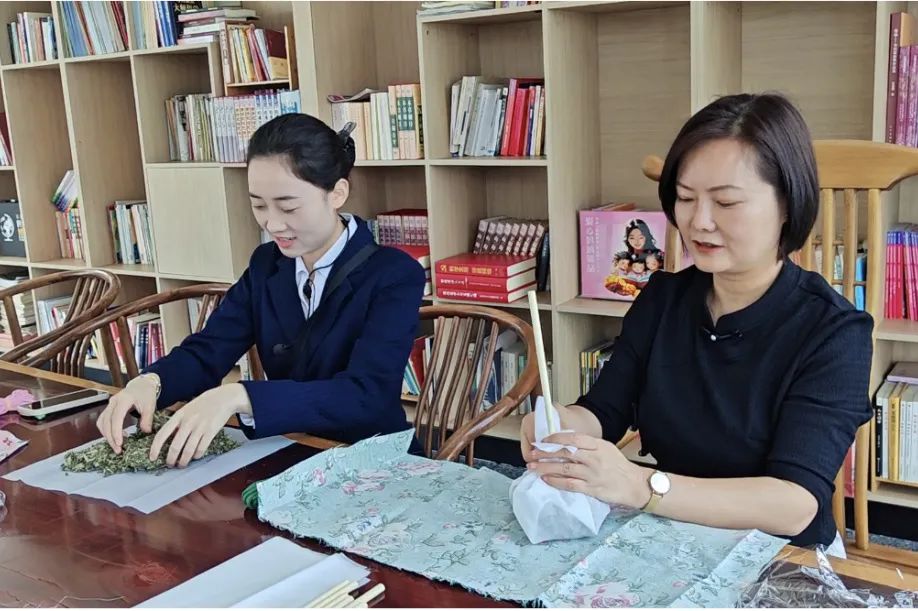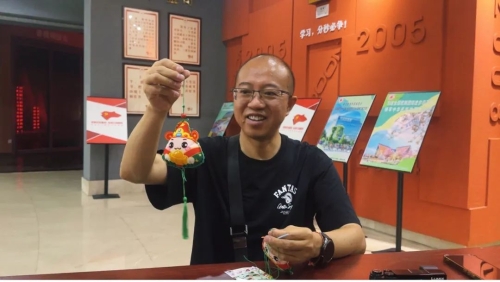 游客在“好人好马”书屋兑换五彩绳、DIY香囊并现场制作。