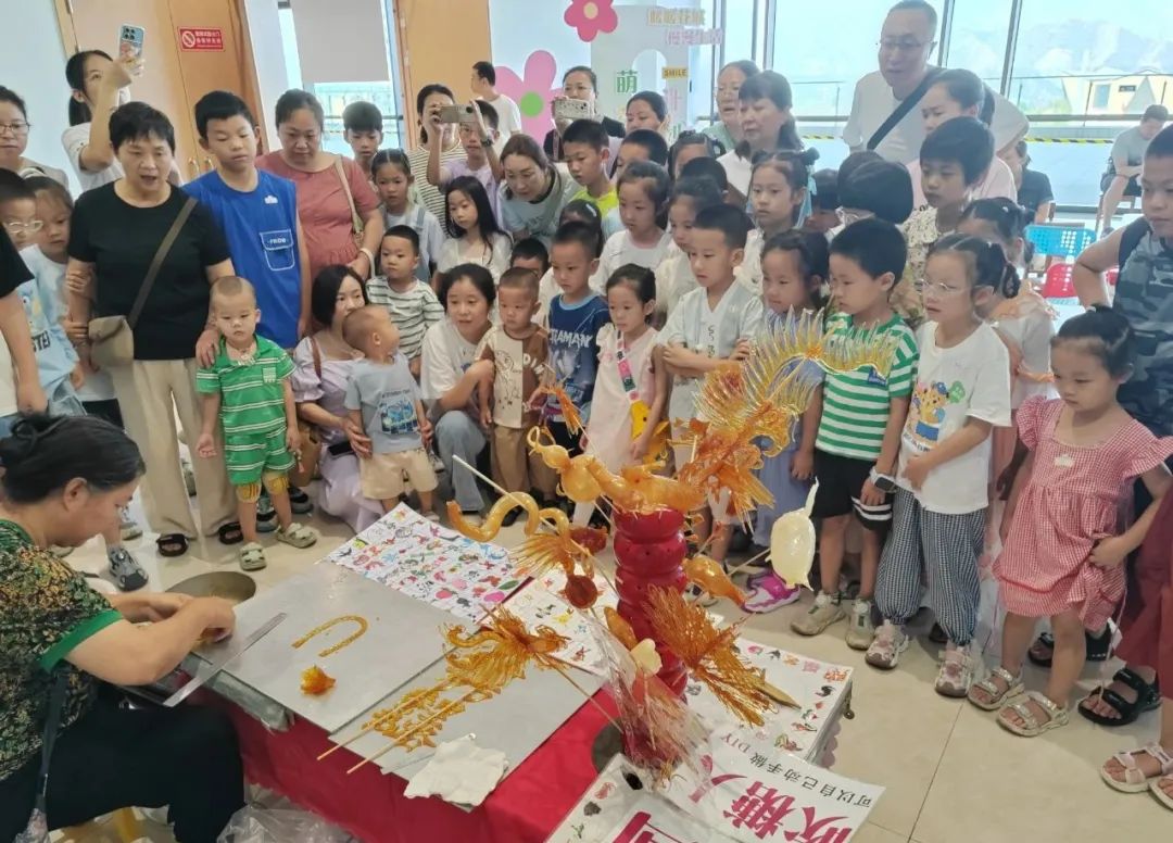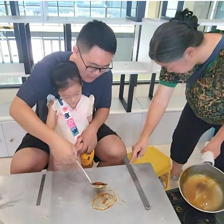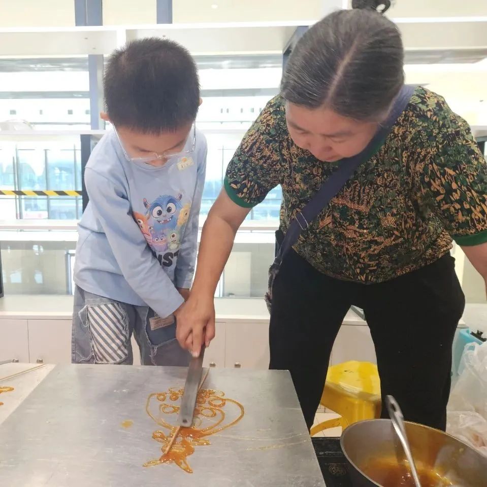 大朋友和小朋友们在唐老师的帮助下尝试亲手制作糖画。