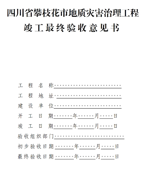 1.特大型地质灾害治理和省级地质灾害抢险治理工程完工后,县(区)级自然资源主管部门应组织勘查、设计、施工、监理单位对所有工程进行初步验收,初步验收合格后报请市级自然资源主管部门组织最终验收。竣工最终验收意见书见附件4。