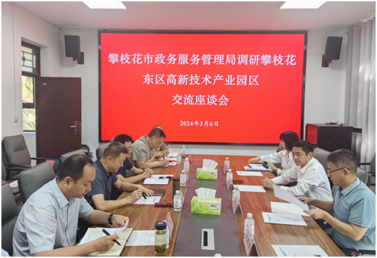调研组一行到东区高新技术产业园区政务服务中心实地察看筹建情况。陈膑与基层负责同志亲切交谈,召开座谈会议、详细了解了园区基本情况、园区政务服务中心方案设计情况以及存在的困难和突出问题、园区政务服务中心事项梳理情况,听取了园区企业代表攀枝花龙佰丰源矿业有限公司、攀枝花钢城集团银山钛钢新材料科技有限公司、攀枝花豪润矿业有限公司三家公司工作人员对园区政务服务工作的相关诉求和意见建议。